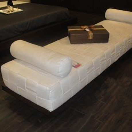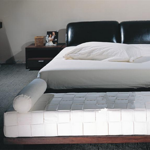 •床尾踏•一款纯白色的床尾踏,造型上简约时尚,内部为橡木,厚实高档。卧室内突然出现的一点白使得空间更加活泼,不至于整个空间都是暗色调