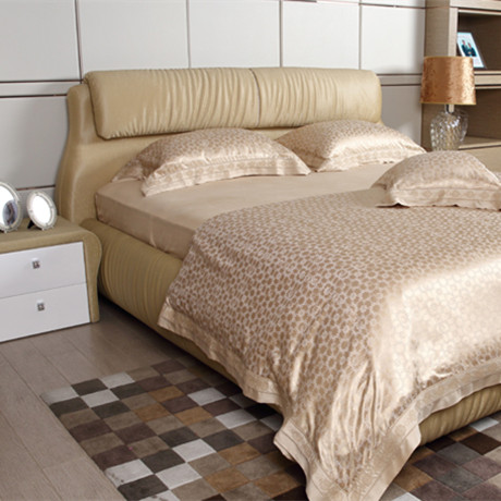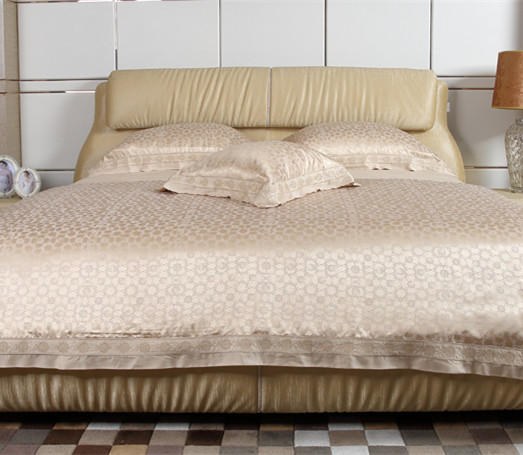 • 床屏设计形状似葫芦,寓意福禄双齐,象征家庭和谐美满。 •床体采用金黄色水纹智能皮,手感柔滑质感温馨。 •床头尾水晶链闪闪耀眼更显高贵。 •真丝天丝床品柔软贴身亲肤透气,精致的绣花边与面料提花纹样形成和谐的搭配。